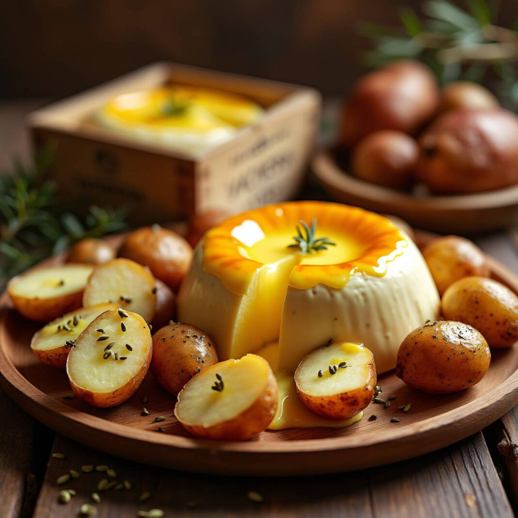 Ein köstliches Rezept für warmen Vacherin, serviert mit gekochten Kartoffeln und Kümmelsamen.