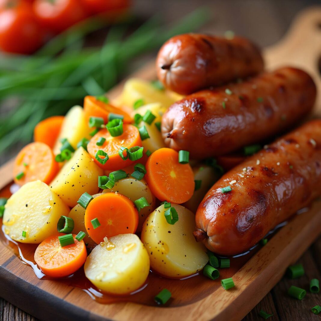 Ein herzhaftes Gericht aus warmem Kartoffelsalat und knusprigen Zwiebelwürstchen, ideal für kalte Tage.