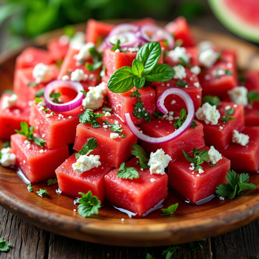 Ein erfrischender Salat aus Wassermelone und Feta, perfekt für warme Tage.