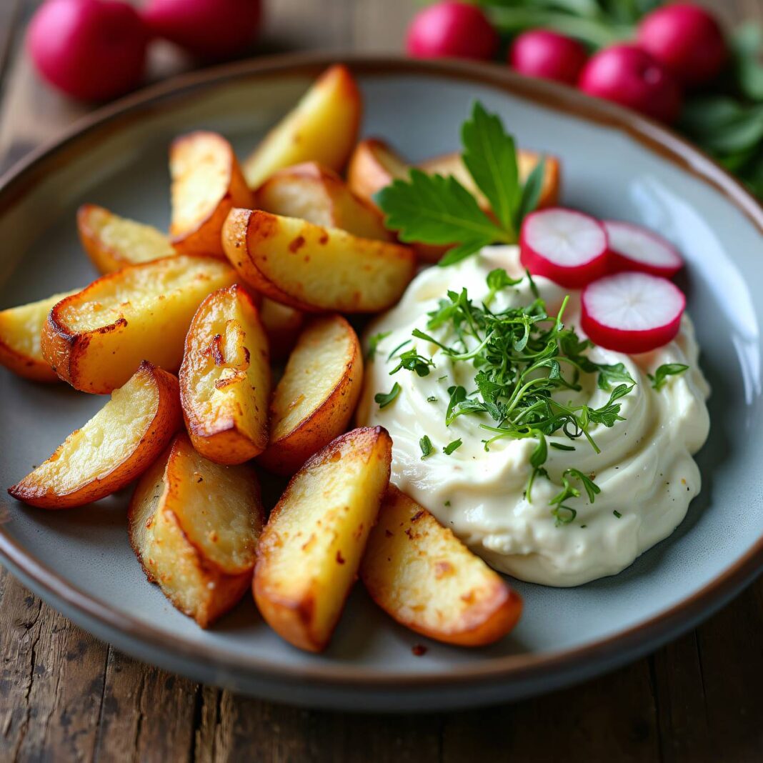Knusprige Wedges aus festkochenden Kartoffeln, serviert mit einem cremigen Bärlauch-Hüttenkäse und frischen Radieschen.