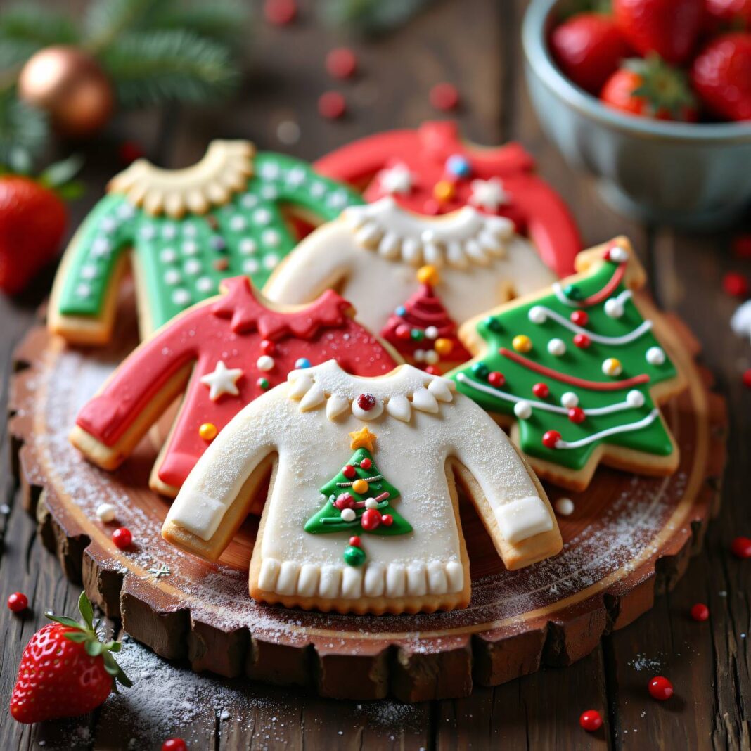 Leckere Kekse in Form von Pullovern, perfekt für die Weihnachtszeit.