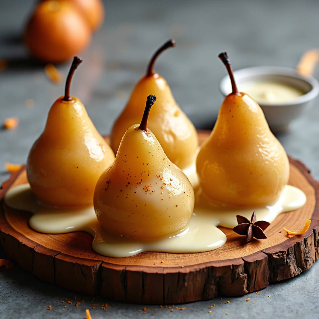 Ein köstliches Dessert mit pochierten Birnen und einer cremigen weißen Schokoladen-Lebkuchensauce.