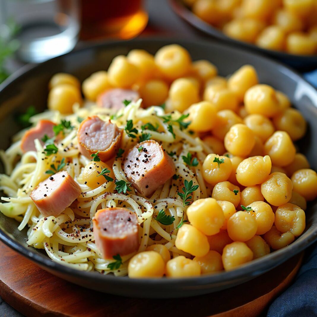 Eine köstliche Weißkohl-Pfanne mit Fleischresten und Frischteigwaren, ideal für ein herzhaftes Hauptgericht.