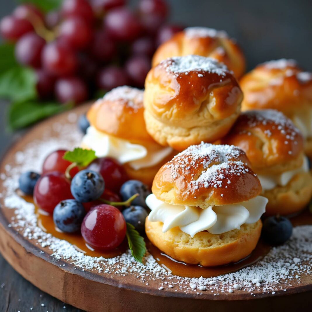 Leckere Windbeutel gefüllt mit Schlagobers und serviert mit frischem Traubensalat.