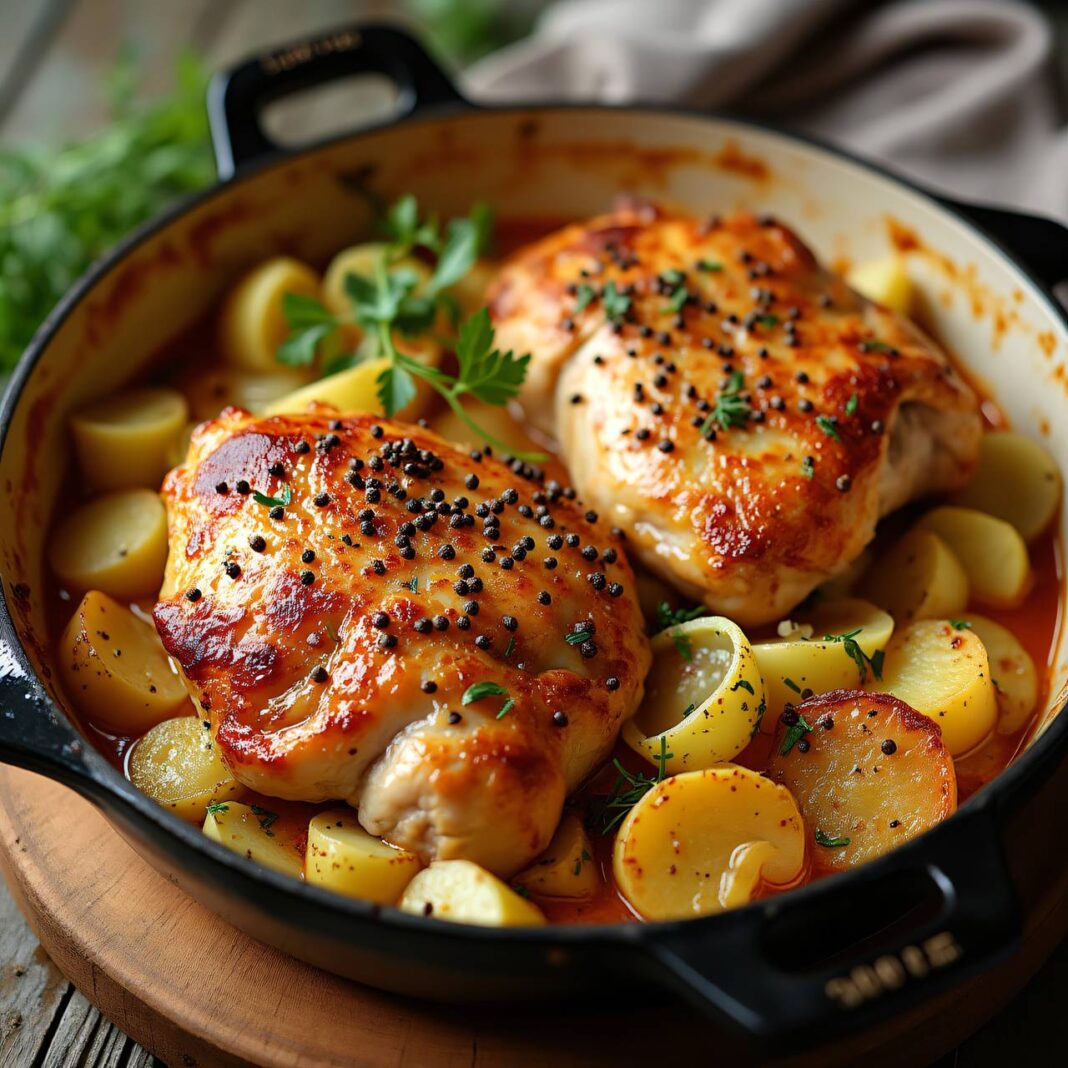 Ein köstliches Gericht aus würzigen Hühnerschenkeln, serviert mit einem cremigen Fenchel-Kartoffel-Gratin.