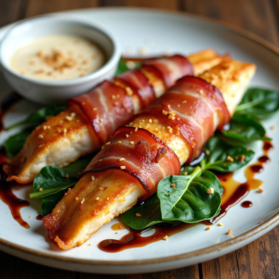 Ein köstliches Gericht aus Zanderfilets, umwickelt mit Bauernspeck, serviert mit einer cremigen Meerrettich-Mandel-Crème.