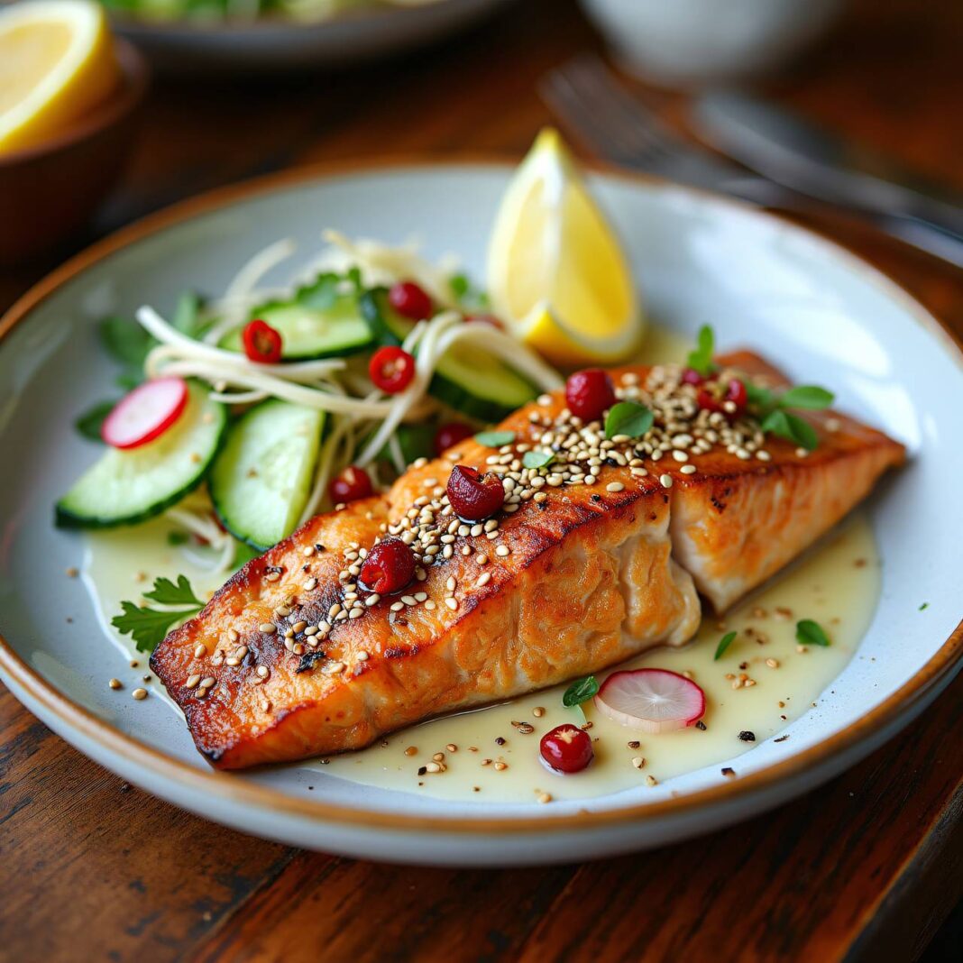 Ein köstliches Rezept für Zanderfilet, serviert mit einer erfrischenden Gurkensalat und einer aromatischen Sesam-Butter.