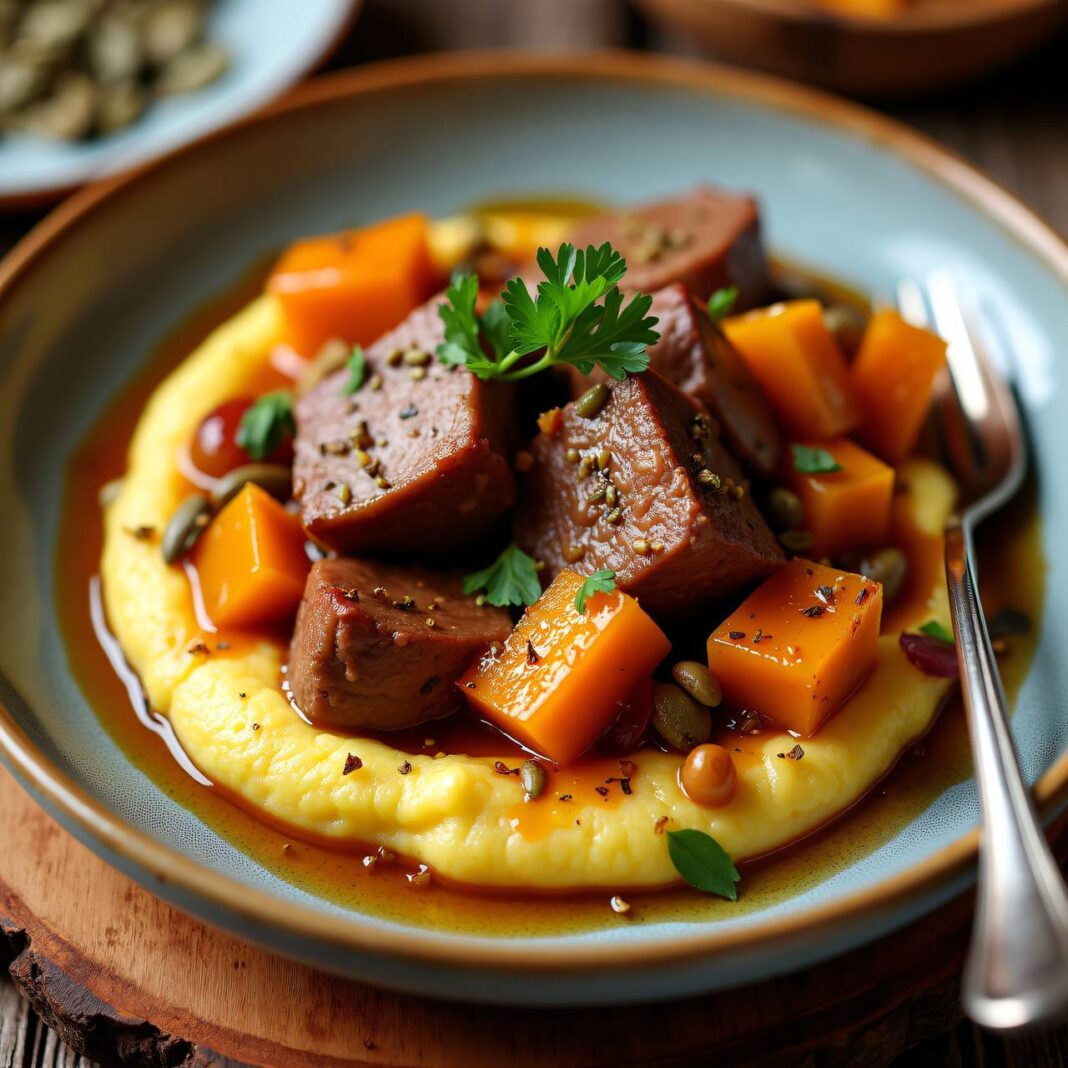 Ein herzhaftes Zimt-Kalbsragout serviert mit cremiger Polenta und aromatischem Honig-Kürbis aus dem Ofen.