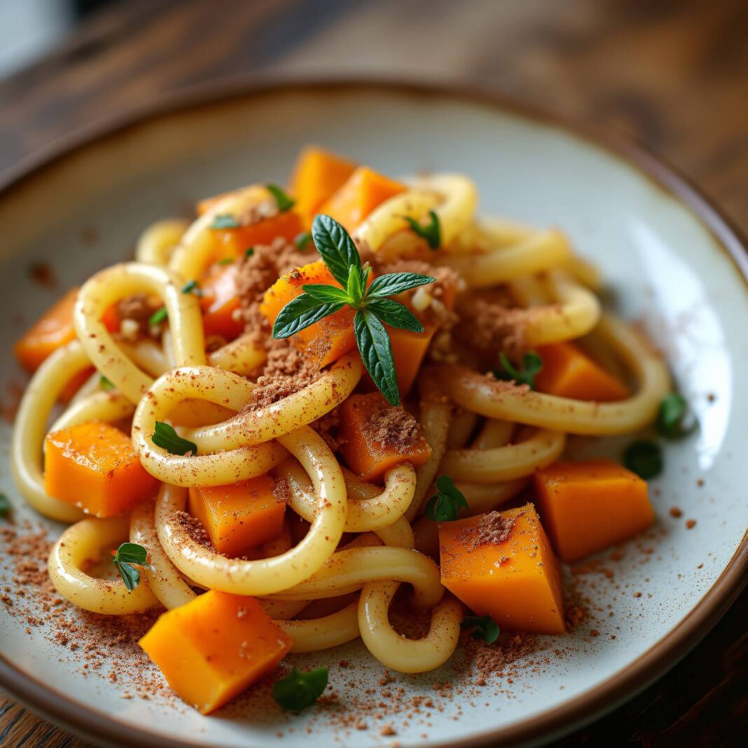 Ein köstliches Rezept für Zimt-Kartoffel-Nudeln, serviert mit aromatischem Kürbisgemüse.