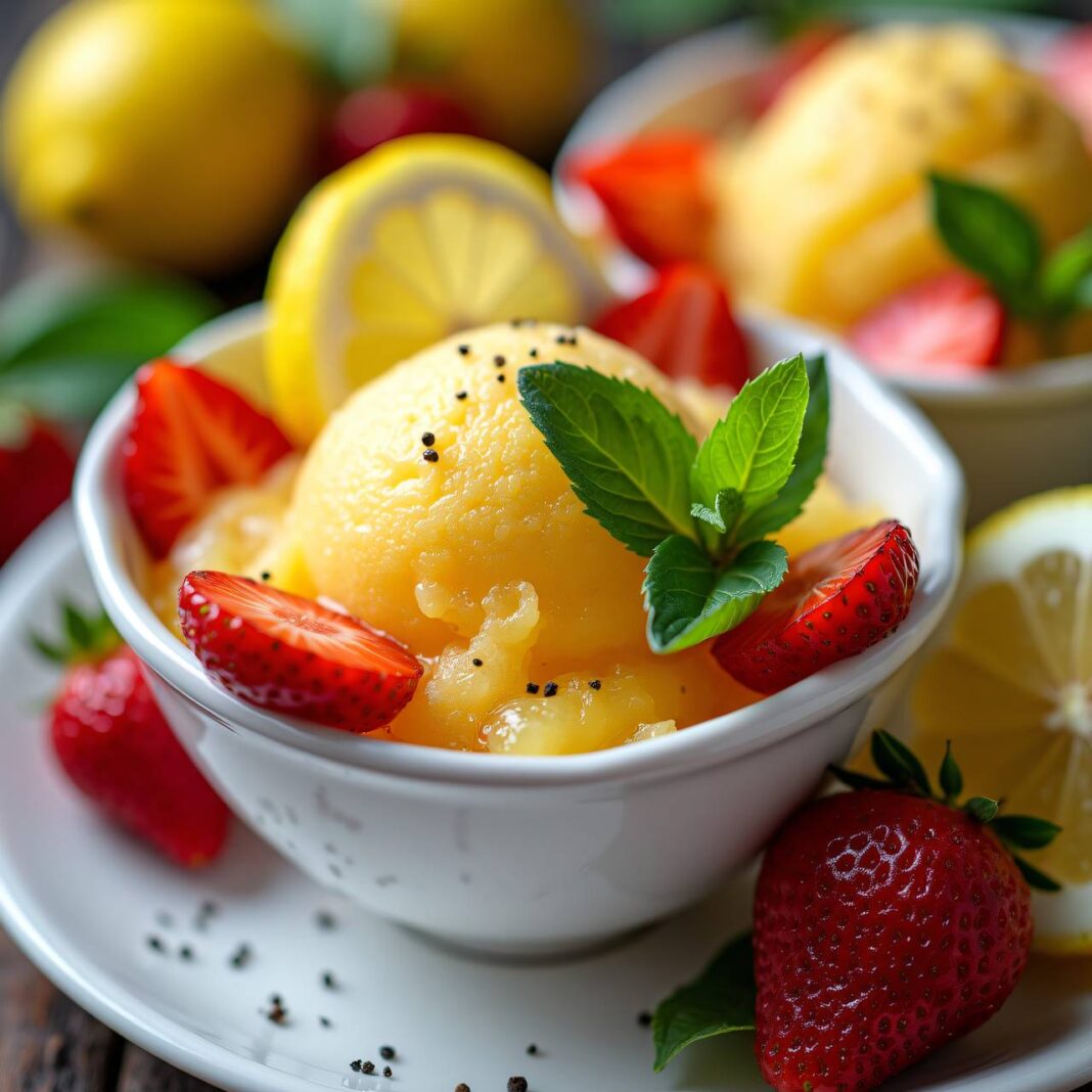 Ein erfrischendes Zitronen-Basilikum-Sorbet, das perfekt für warme Tage ist.
