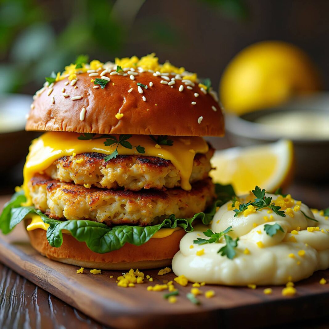 Ein köstlicher und gesunder Zitronen-Hühnchen-Burger serviert mit cremigem Blumenkohlkäsepüree, ideal für eine Low Carb Ernährung.
