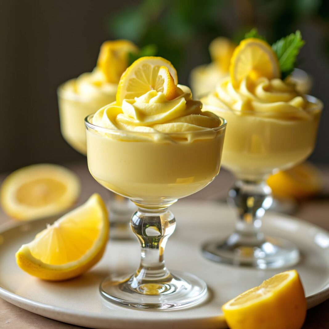- Fülle die Creme in Dessertschälchen und garniere sie mit den hauchdünn geschnittenen Zitronenscheiben.