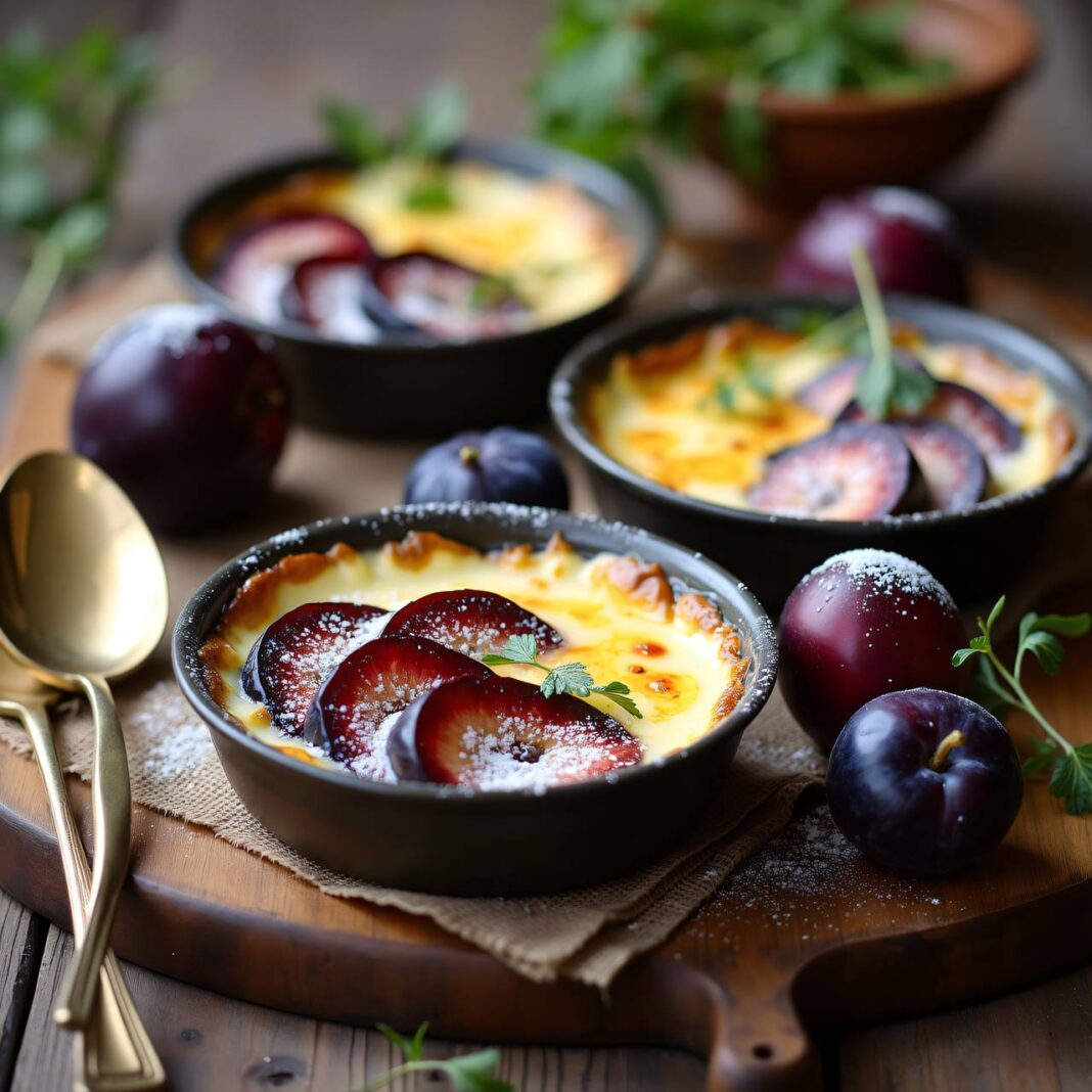 Ein köstliches Zwetschgen-Koriander-Gratin, das warm serviert wird und eine perfekte Kombination aus fruchtigen Zwetschgen und einer cremigen Koriander-Creme bietet.